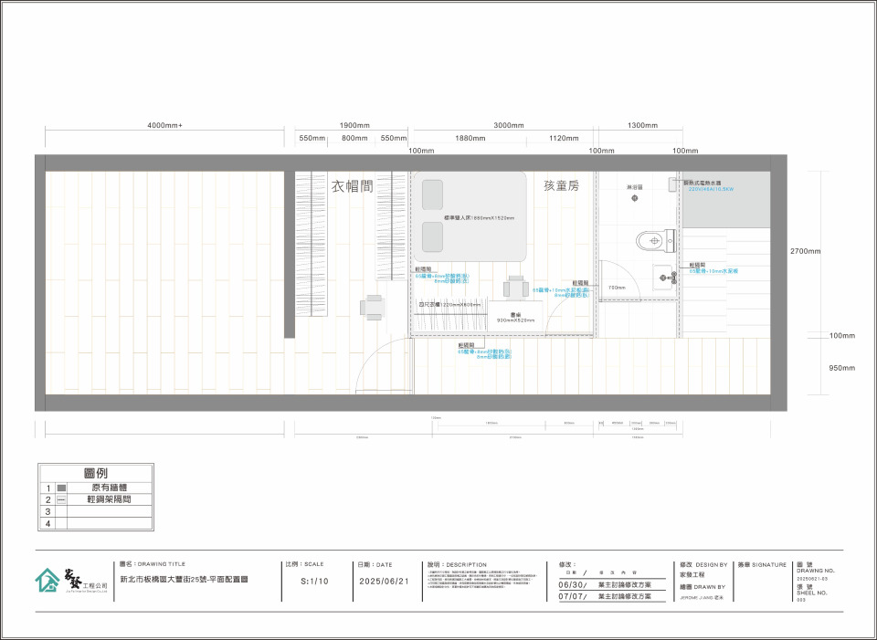 業主想要利用暑假改造已經住了二十年的房子,主臥整間並且增加衣帽間跟新增孩童房並且增加一間廁所淋浴間。水電線路管路重新更換,冷氣新裝、牆面防水、屋頂防水、牆面粉刷油漆、卡扣式耐磨木地板、燈具、儲熱市電熱水器、衛浴三間套櫃式洗手台、浴室三合一通風機,工程清潔乙式、三十工作日完工交場。預算70萬